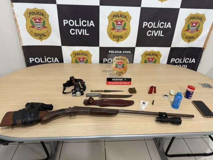 Policiais civis da Delegacia de Piraju prenderam, na manhã desta quinta-feira (11), um homem de 20 anos após flagrá-lo portando uma espingarda calibre 28 na Vila Saens. O suspeito foi visto na garupa de um mototáxi exibindo a arma de forma ostensiva, o que motivou intervenção imediata da equipe policial.