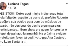 A renomada cantora Luciana Tegani usou as redes sociais para mostrar sua indignação com a falta de pagamento de cachês para os músicos avareenses...