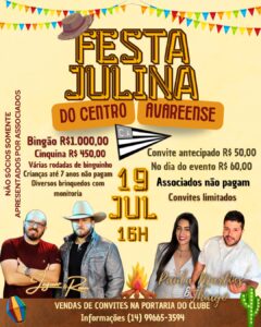 O clube também agendou para o próximo dia 19, a partir das 16h00, sua tradicional festa Julina, que terá apresentação de duas duplas, bingão de mil reais, brinquedos com monitoria para as crianças além de outras atrações. Mais informações na secretaria do clube.