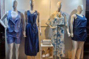 Vestidos, blusas, conjuntos e bermudas fluídos ganham destaque em tons claros e suaves, como o azul celeste (Baby Blue), que domina a alfaiataria descontraída, aparecendo em calças e blazers de linho que garantem um visual casual chic e relaxante.