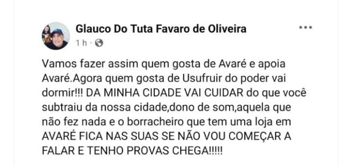 Mesmo após um ano, uma publicação do agente público Glauco Fabiano Favaro de Oliveira (conhecido como Glauco do Tuta), atual Secretário de Chefia de Gabinete da Prefeitura de Avaré, continua repercutindo entre munícipes já que a postagem em redes sociais gerou reações imediatas da população e até hoje não foi explicada.