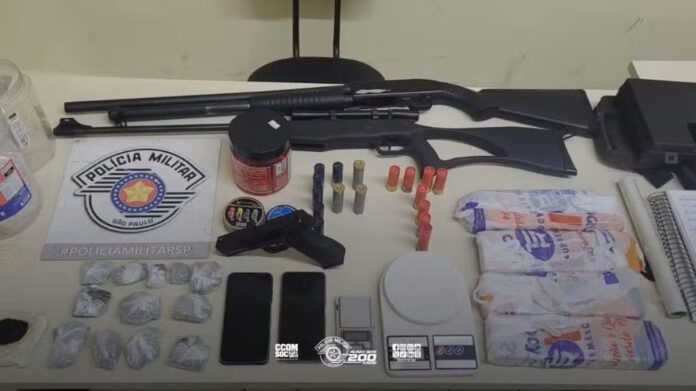 Em um dos endereços, na represa, os agentes localizaram a mulher e o filho do casal. No imóvel, foram encontrados quatro tijolos de maconha armazenados dentro de uma geladeira. Durante a busca domiciliar, também foram apreendidos uma arma longa calibre .12, uma espingarda, um simulacro de pistola, munições, uma balança de precisão e anotações relacionadas ao tráfico.