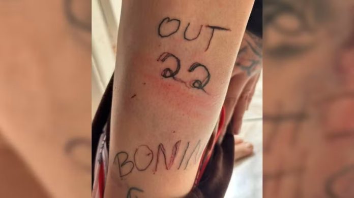 Imagens publicadas pela TV TEM mostram que a mulher foi tatuada à força em diversas regiões do corpo. Nas pernas, é possível ver nomes, siglas e a data de “outubro de 2022”.