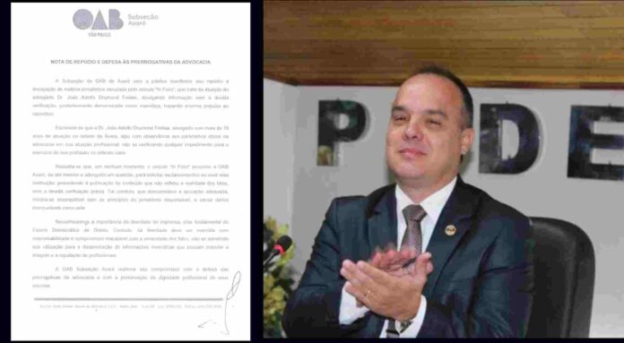 A Subseção da OAB de Avaré vem a público manifestar seu repúdio à divulgação de matéria jornalistica veiculada pelo veículo “In Foco”, que trata da atuação do advogado Dr. João Adolfo Drumond Freitas, divulgando informação sem a devida verificação, posteriormente demonstrada como inverídica, trazendo enorme prejuizo ao causidico.