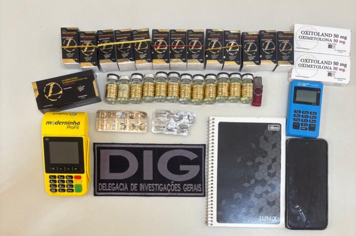 No imóvel, os agentes localizaram diversas substâncias de uso controlado, entre elas Oximetolona, Clembuterol e Cytotec, além de ampolas e caixas de esteroides anabolizantes como Drostanolona Propionato, Testenat Depot, Durateston Plus Gold, Trembolona Enantato e Decaland Depot. Segundo o registro policial, o próprio investigado indicou onde os materiais estavam armazenados.