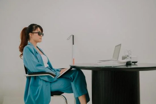 #PraCegoVer: A imagem que ilustra esta matéria traz uma mulher portadora de deficiência visual, com trajes em azul, sentada à uma mesa e com um livro apoiado em uma das pernas, tendo a frente um notebook sob a mesa e também tem alguns livros. Encostada na parede atrás da mesa aparece uma bengala branca e vermelha, utilizada por pessoas com surdocegueira, que, em diferentes graus, têm a audição e a visão comprometidas.