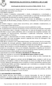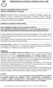 A Prefeitura de Avaré publicou o edital da Concorrência Pública nº 003/2026, visando a contratação de uma empresa especializada em serviços de publicidade. O certame, que será decidido pelos critérios de Técnica e Preço, estima um investimento de R$ 4.000.000,00 (quatro milhões de reais) para um período de 12 meses.