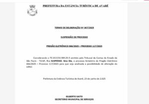 A secretaria de Serviços de Avaré suspendeu nesta segunda, dia 23, edital de pregão eletrônico (066 – processo 117/2025) cujo valor global estimado seria de R$ 11.548.705,43 para eventual contratação de serviços de tapa-buracos, totalizando cerca de 145 mil m2 em obras.