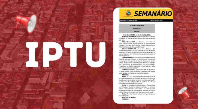 Em uma decisão que marca uma importante vitória para a população avareense, o Prefeito Roberto de Araújo (PL) assinou o Decreto nº 8.724/2026, suspendendo o lançamento da Taxa de Proteção a Desastres. A medida ocorre após uma forte articulação dos vereadores Luiz Claudio da Costa e Adalgisa Ward (Podemos), que acionaram o Ministério Público para barrar a cobrança.